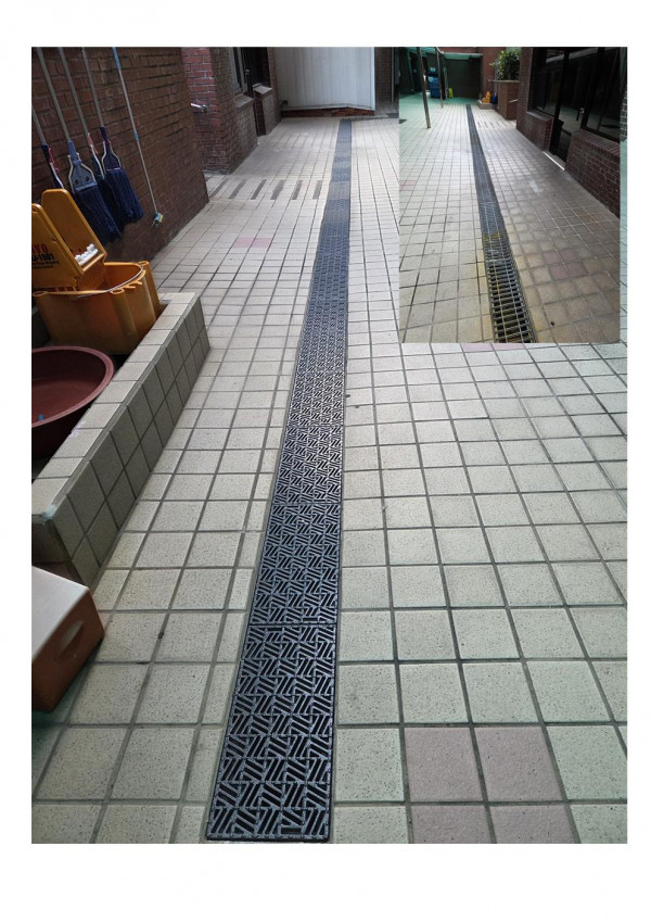 기존 측구에 설치된 스틸그레이팅이 빗물에의해 미끄럽고 낙엽 및 쓰레기유입이 많아 칼라3무그레이팅(300*500)으로